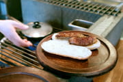 このボリュームたっぷりの極太チョリソーは、特注の焼き場に作った炭火でじっくり一時間ほど下火を入れ、そこからしばらく置いて旨味を閉じ込めたものを、注文が入ってから、お客さまの目の前で再度加熱してご提供しています。